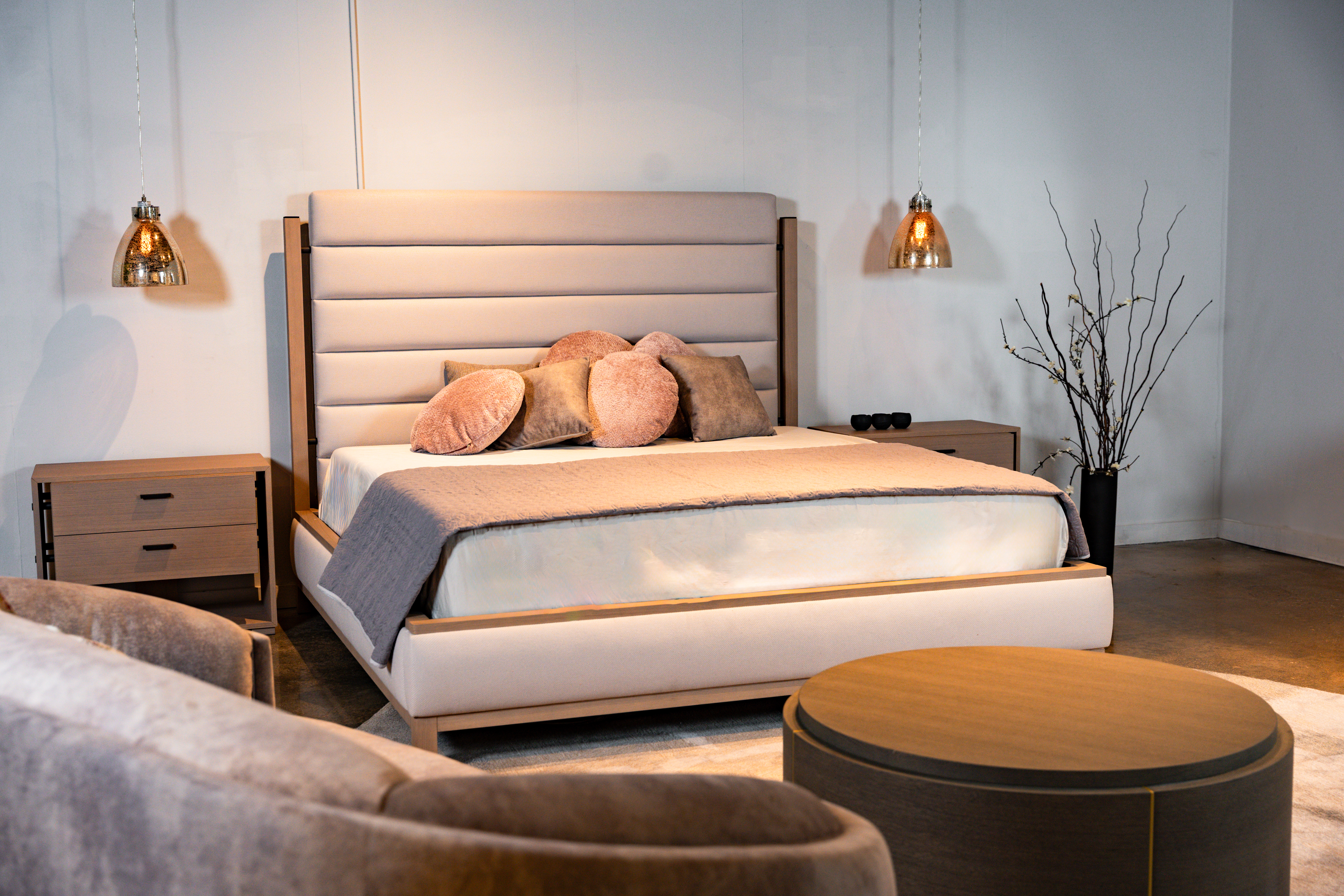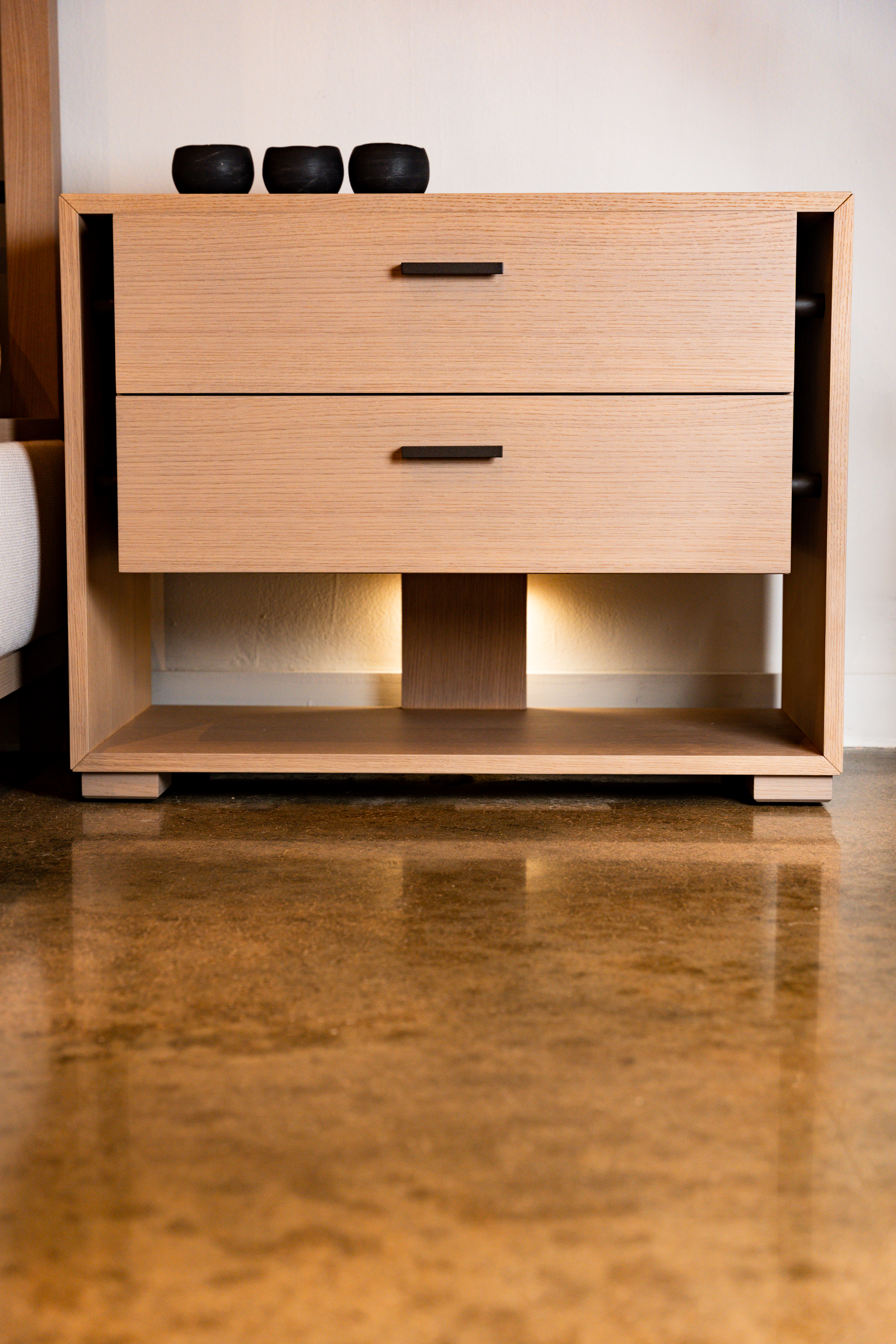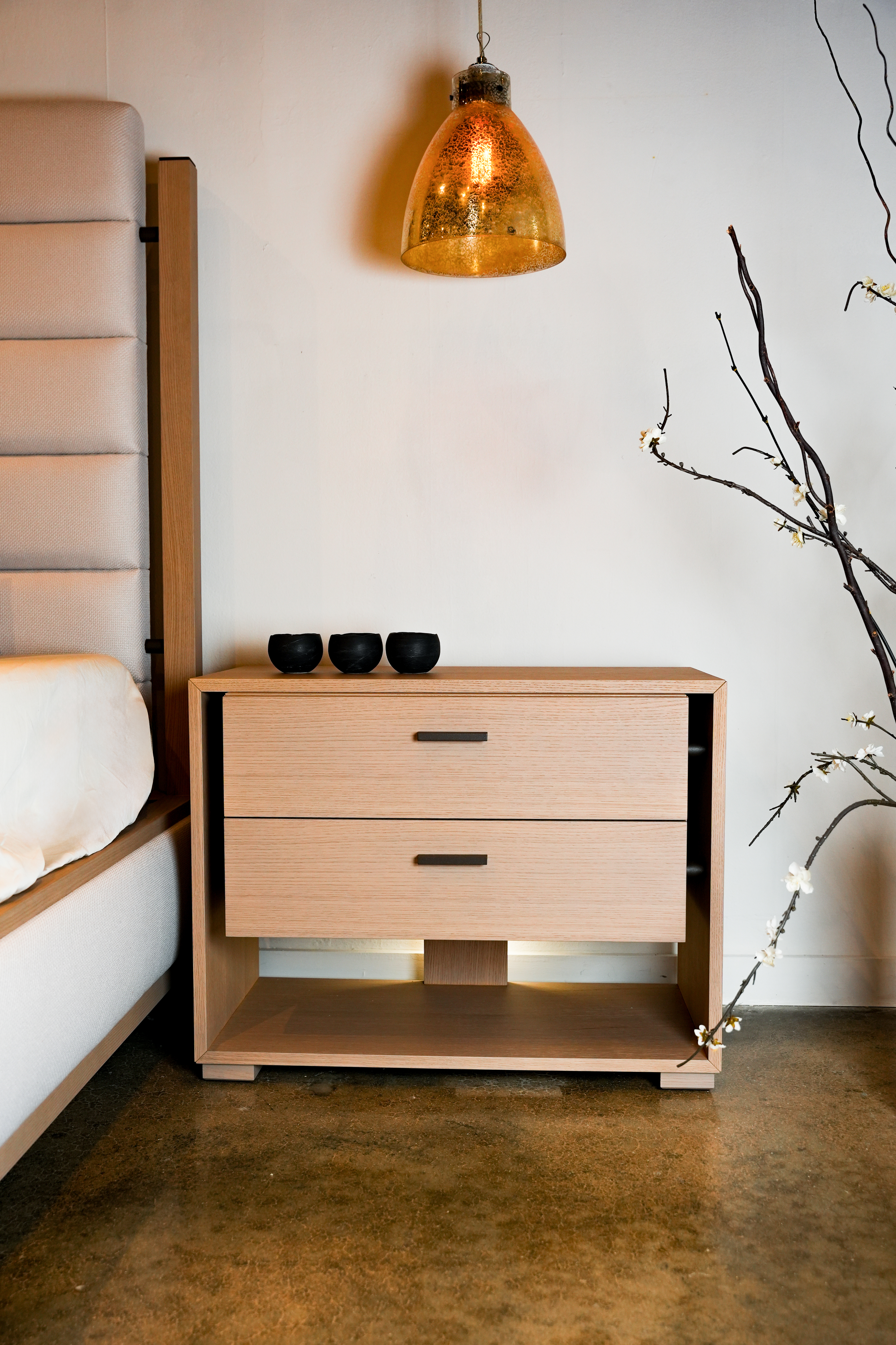 Morgan King Size Bed incl Slats, 2x Nightstands, 1x Dresser Finish: Light Oak with Painted Iron Accents & Upholstery in Braid #3026 Bed Dimensions: W84 3/4" x H59 1/2" x D89 1/4" Nightstand: W31 1/2" x H24 1/2" x D17 3/4" Dresser: W70 7/8" x H33" x D21 5/8" Email: info@planumfurniture.com if you are interested