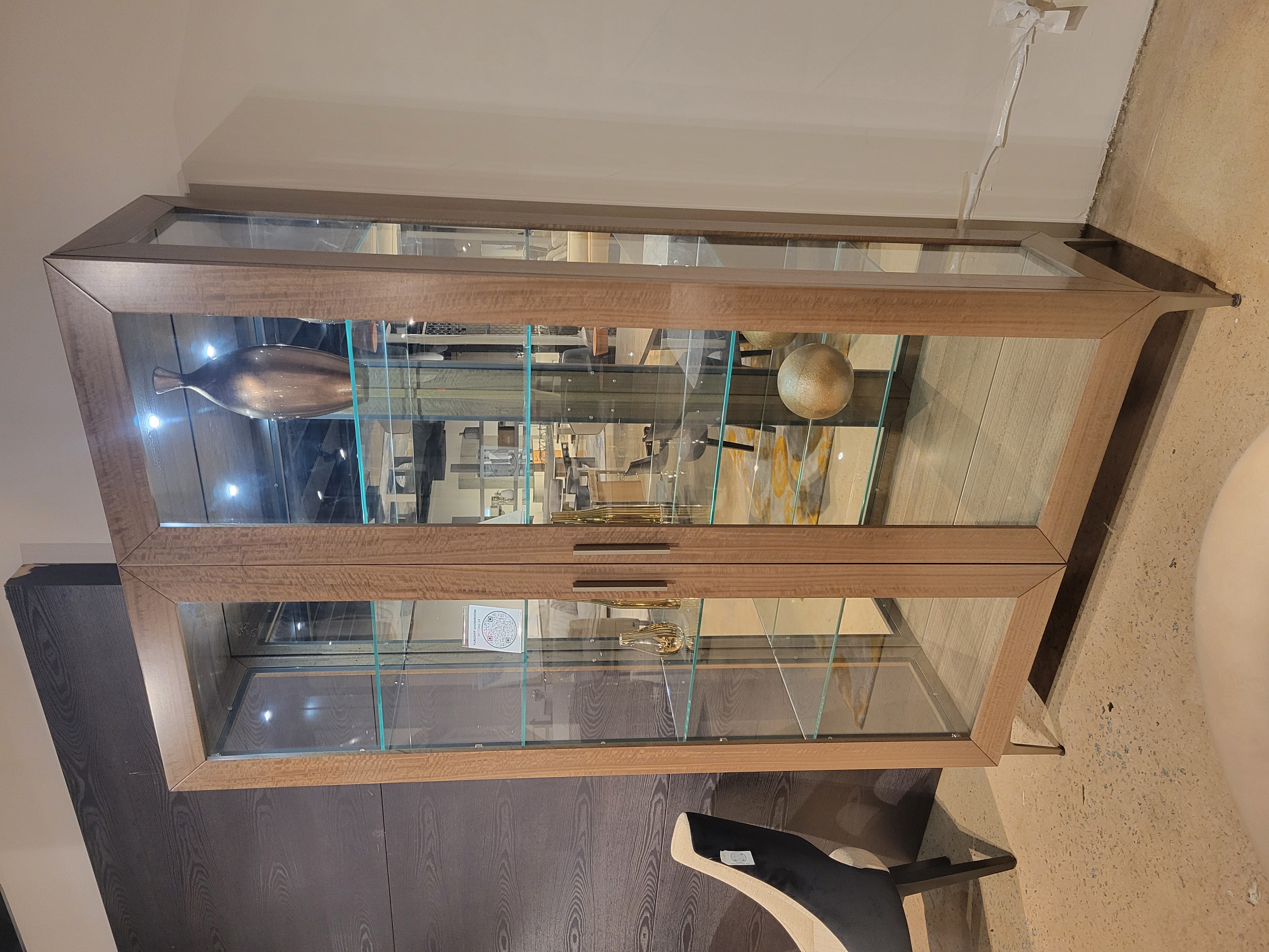 Madison Vitrine, Glass Shelves & Mirrored Back ; Finish: Gray Eucalyptus Frise (30% Sheen) w/ Top, Handles & Legs in Metallic Lacquer ; Dimensions: W48" x H86" x D18 7/8" ; Email: info@planumfurniture.com if you are interested