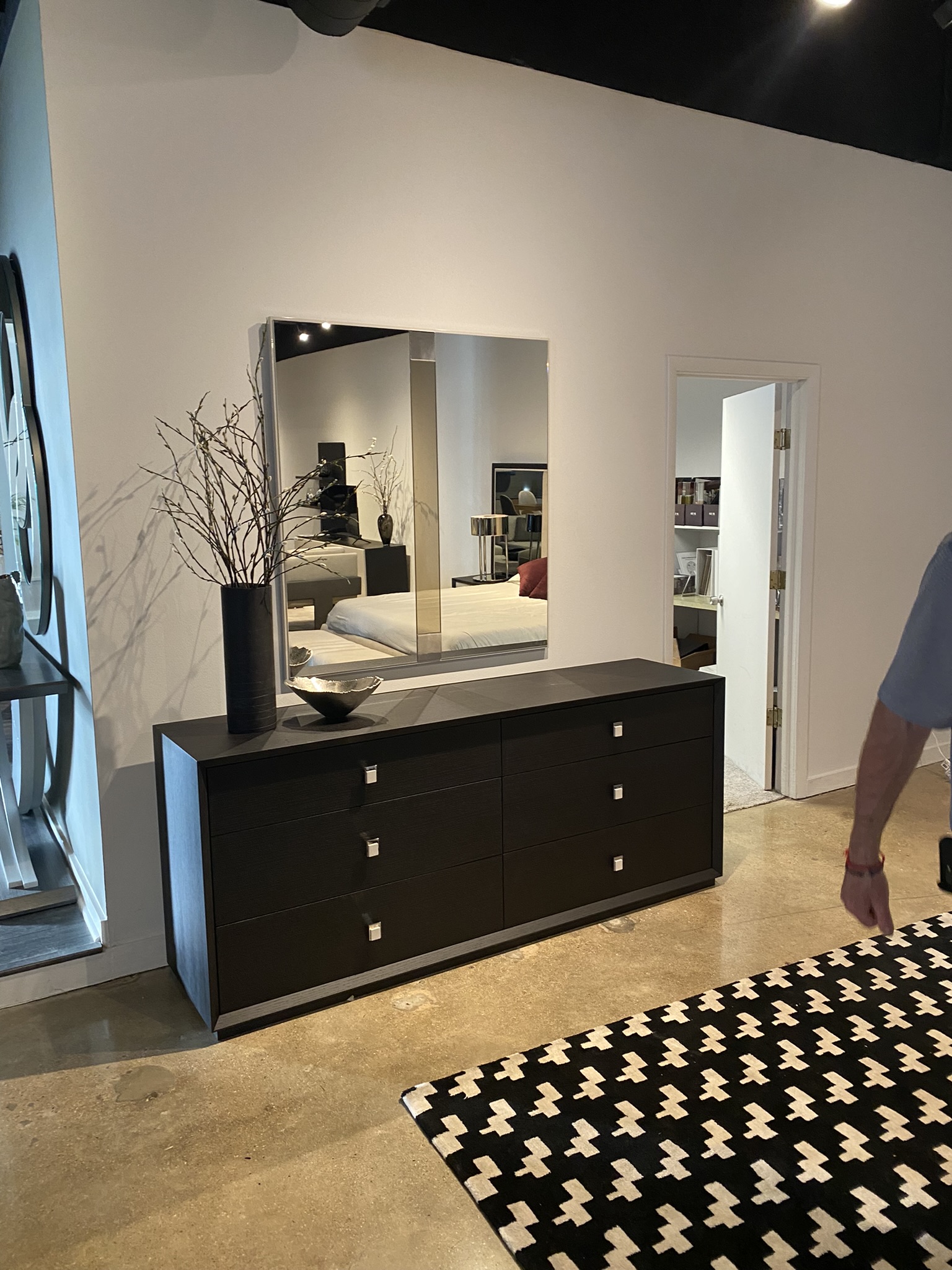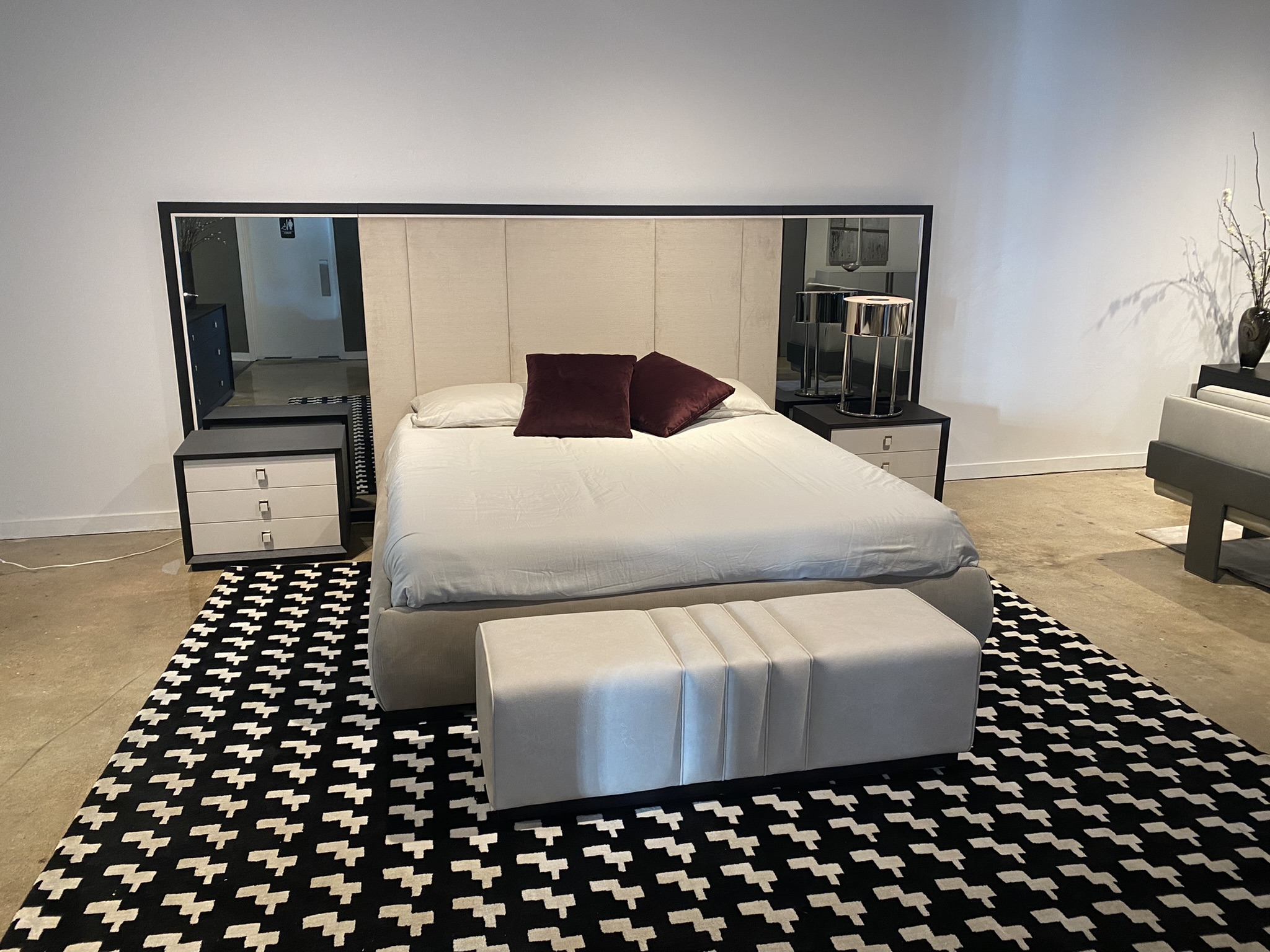 Finish: Black Oak, Gray Mirror Panels, Gray Lacquer, Stainless Steel Accents & Upholstery in Rioma Lin 82 Fabric