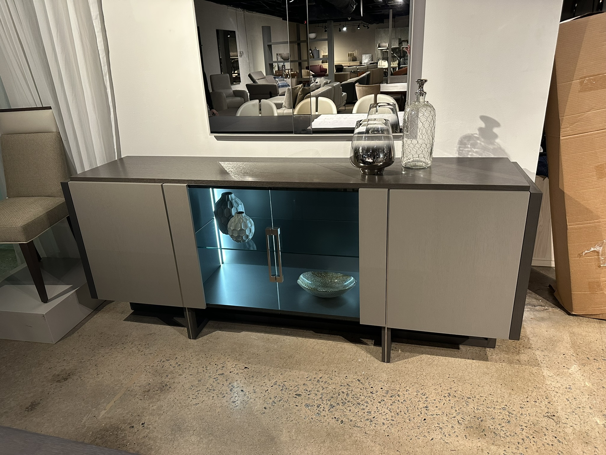 Finish: Top, Sides, Legs in CV16 Oak, Fronts in CV09 Oak, Interior in Metallic Gray Lacquer w/ Grey Glass & Brushed Stainless Steel Accents ;