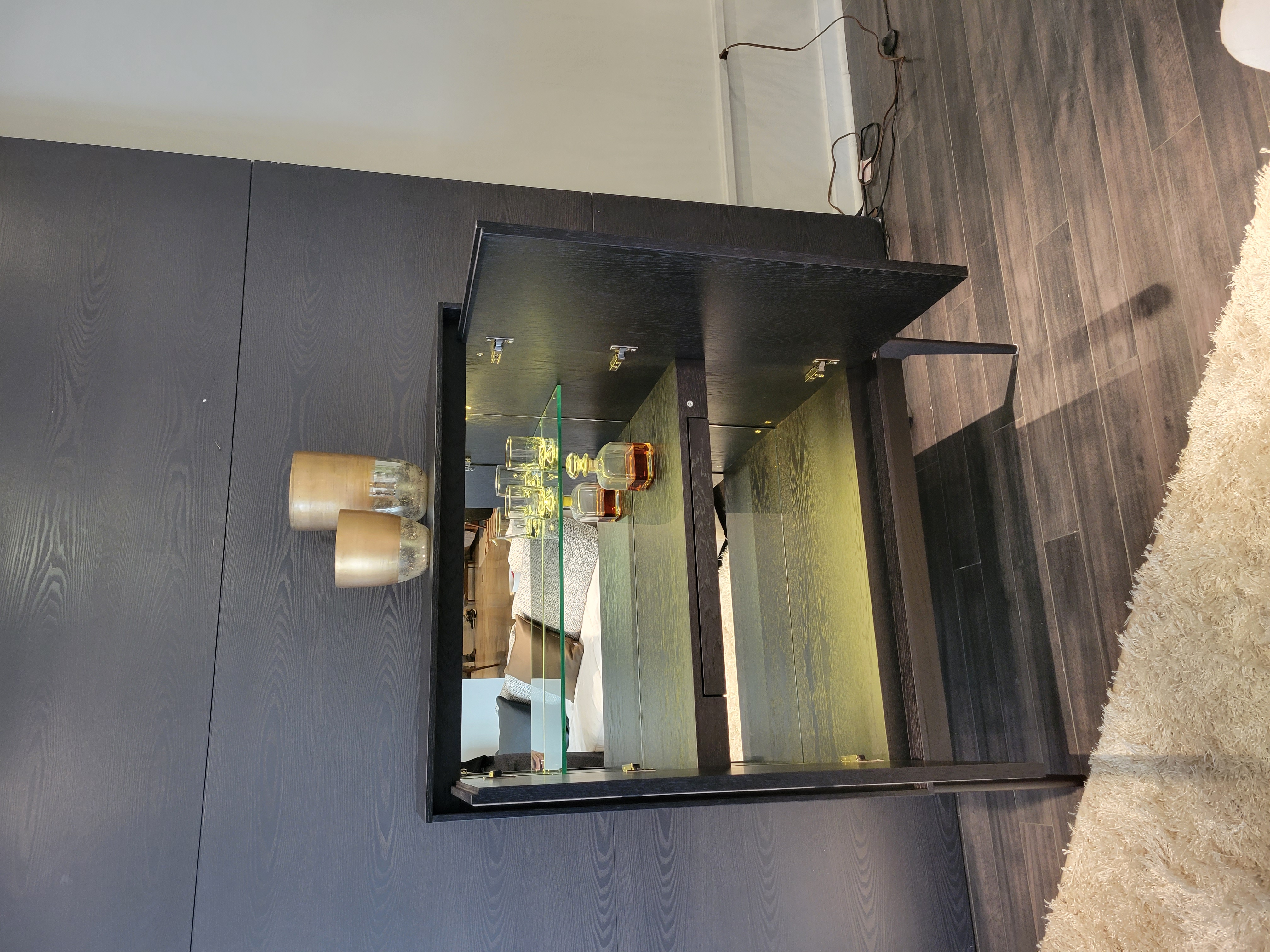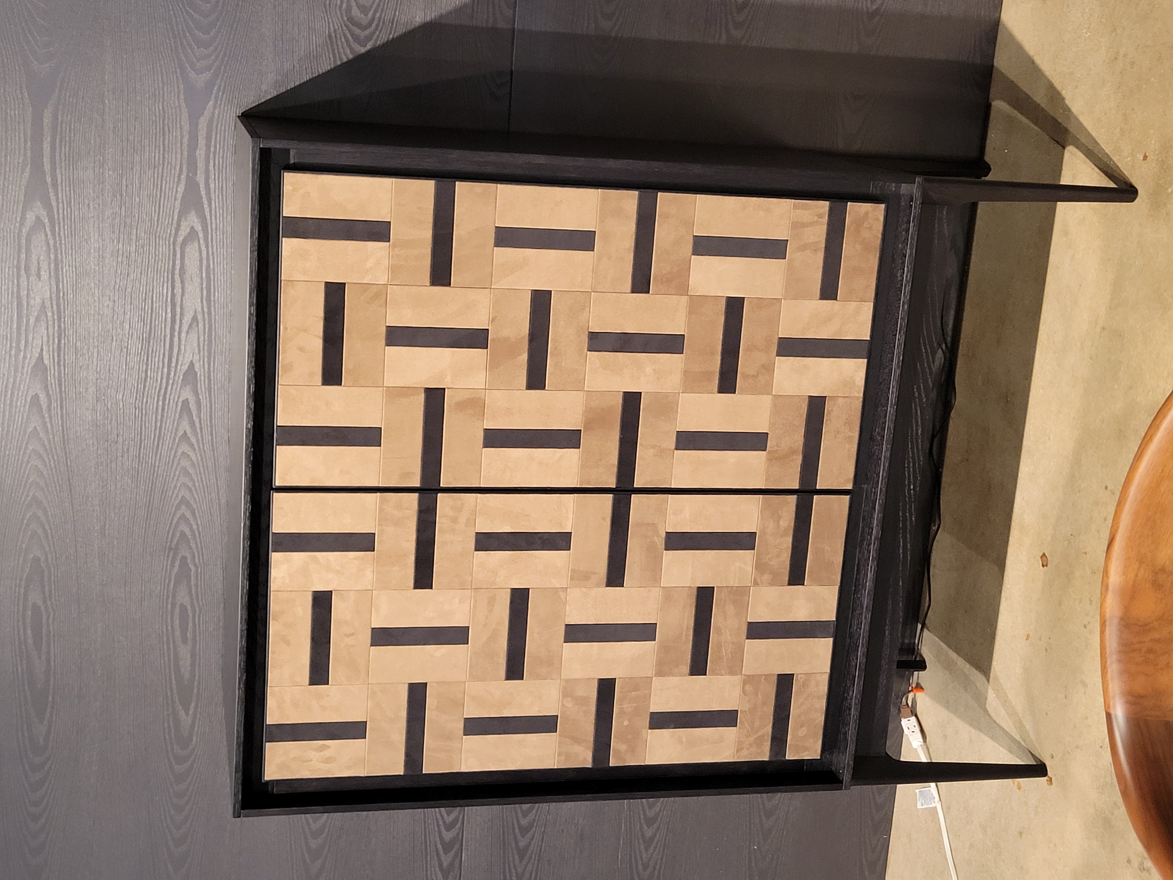 Finish: Black Oak w/ Upholstered Door Fronts in Fabric Switch Colors Mushroom & Onyx;