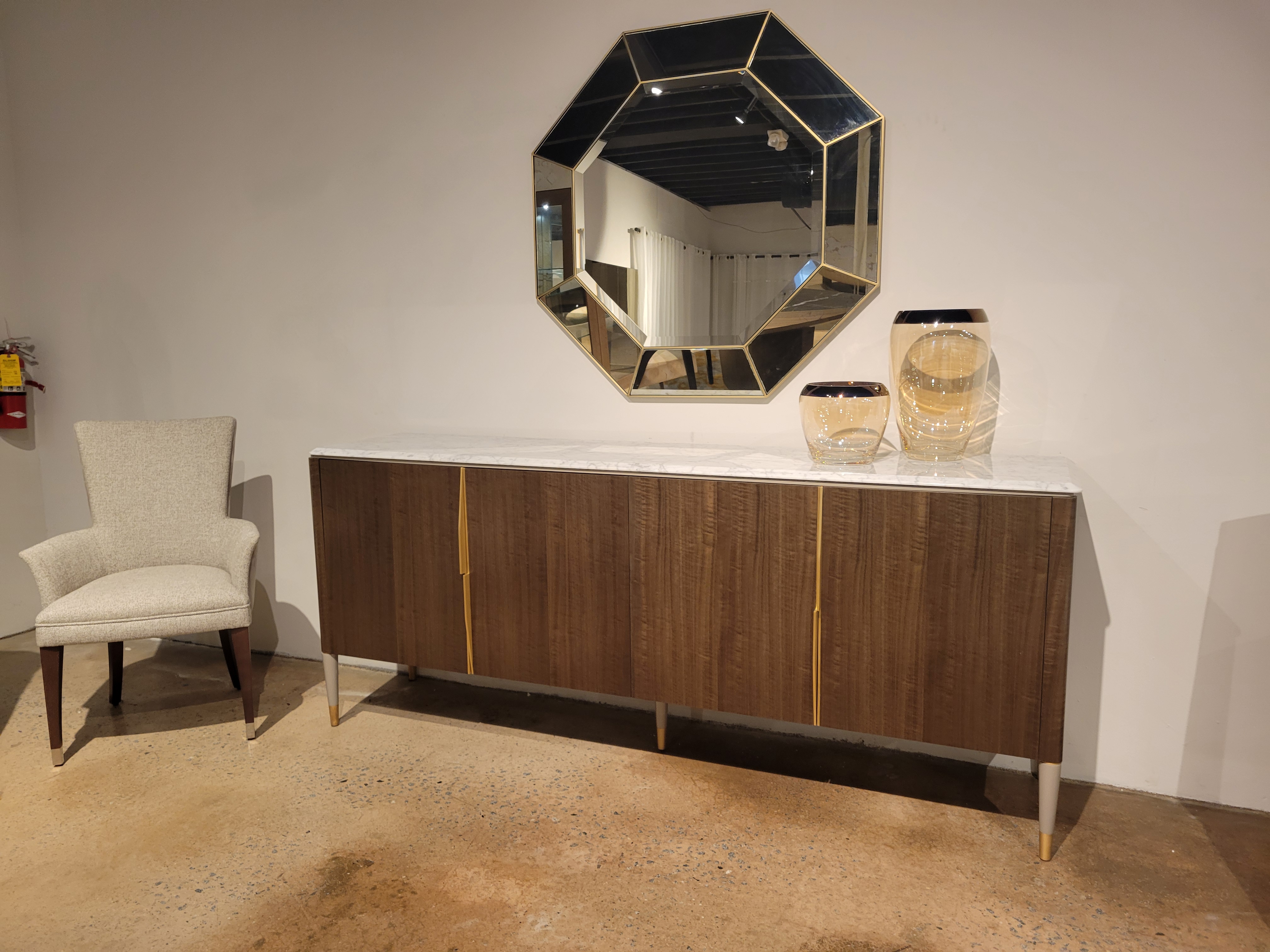 Finish: White Mable Top, Case in Grey Eucalyptus Frise, Sides in Cappuccino Lacquer & Brass Metal Accents ;