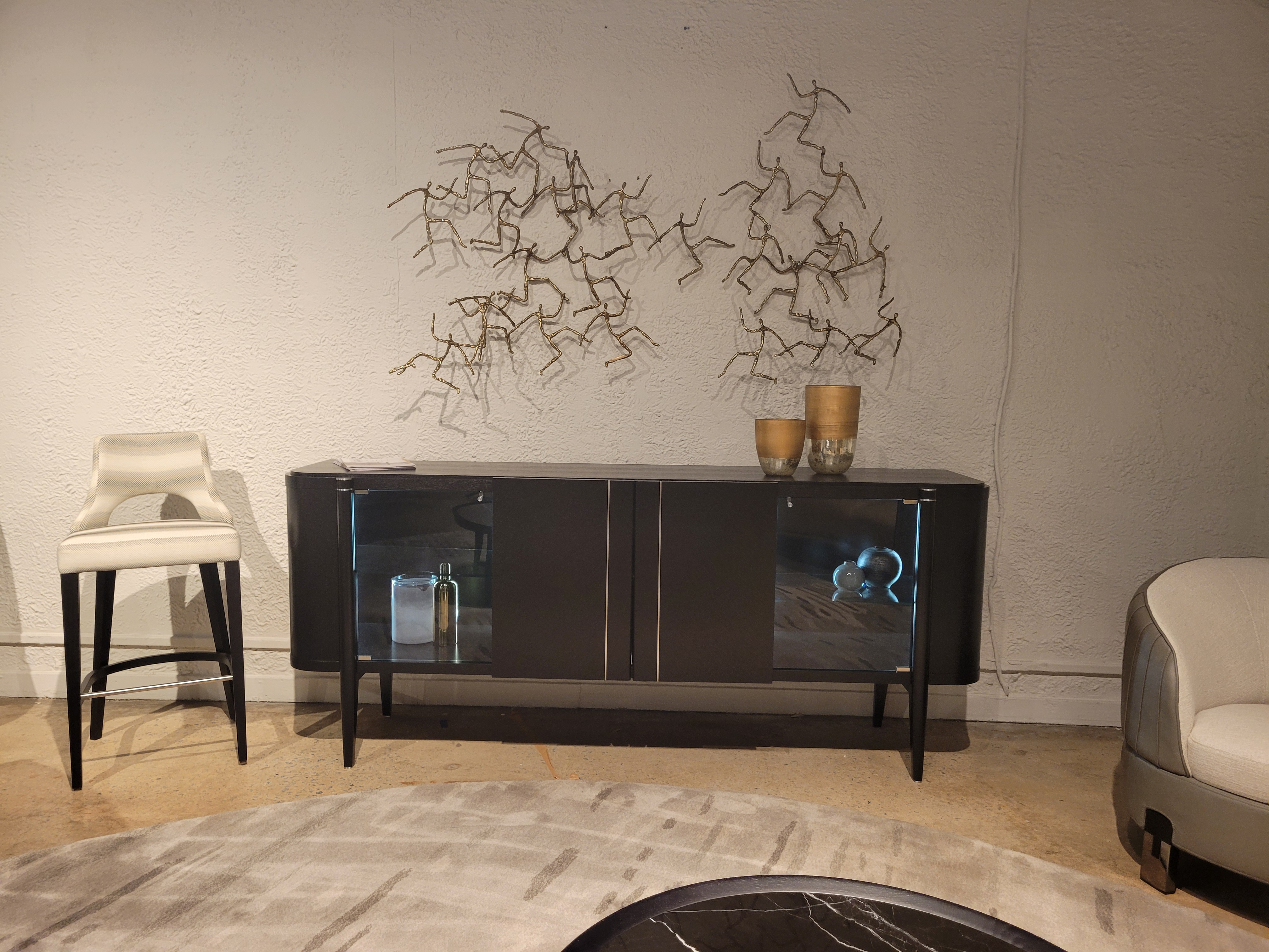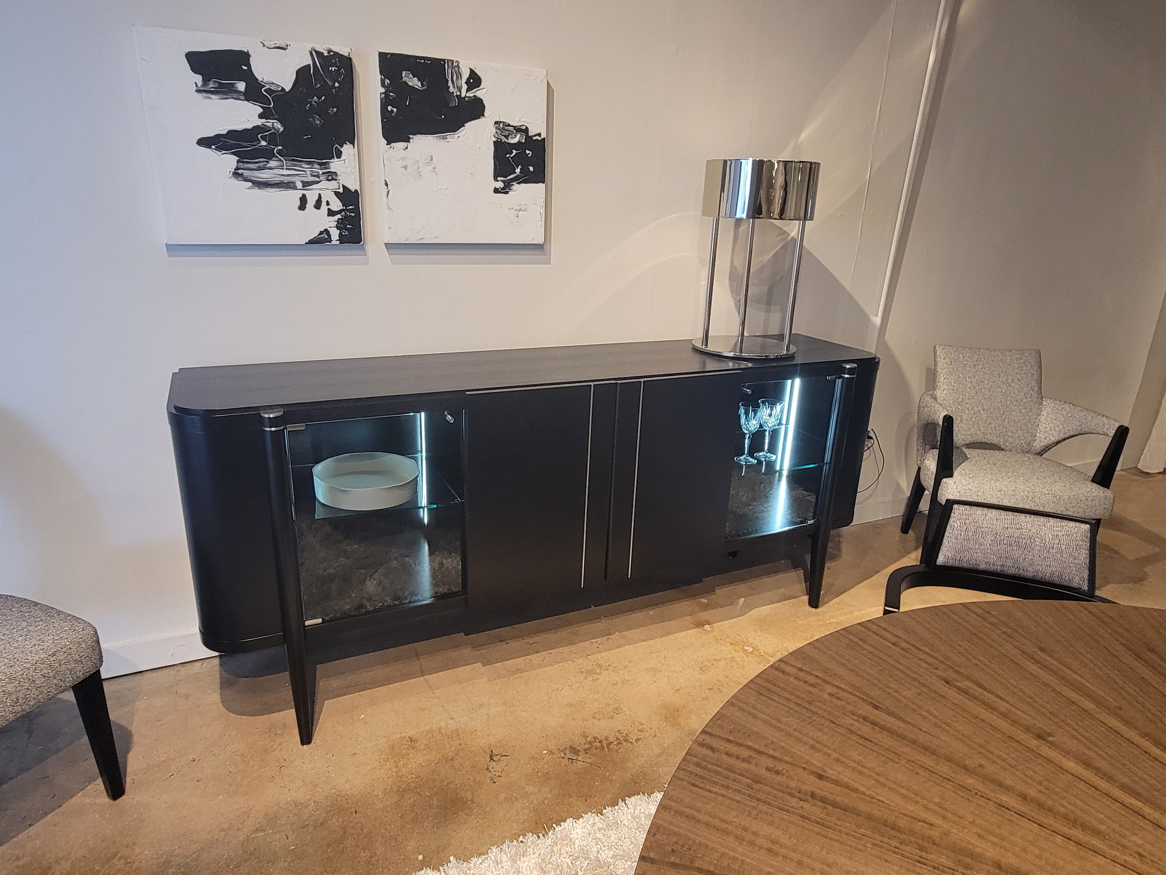 Finish: Black Oak w/ Legs & Interior in Black Lacquer, Grey Glass & Brushed Stainless Steel Accents ;