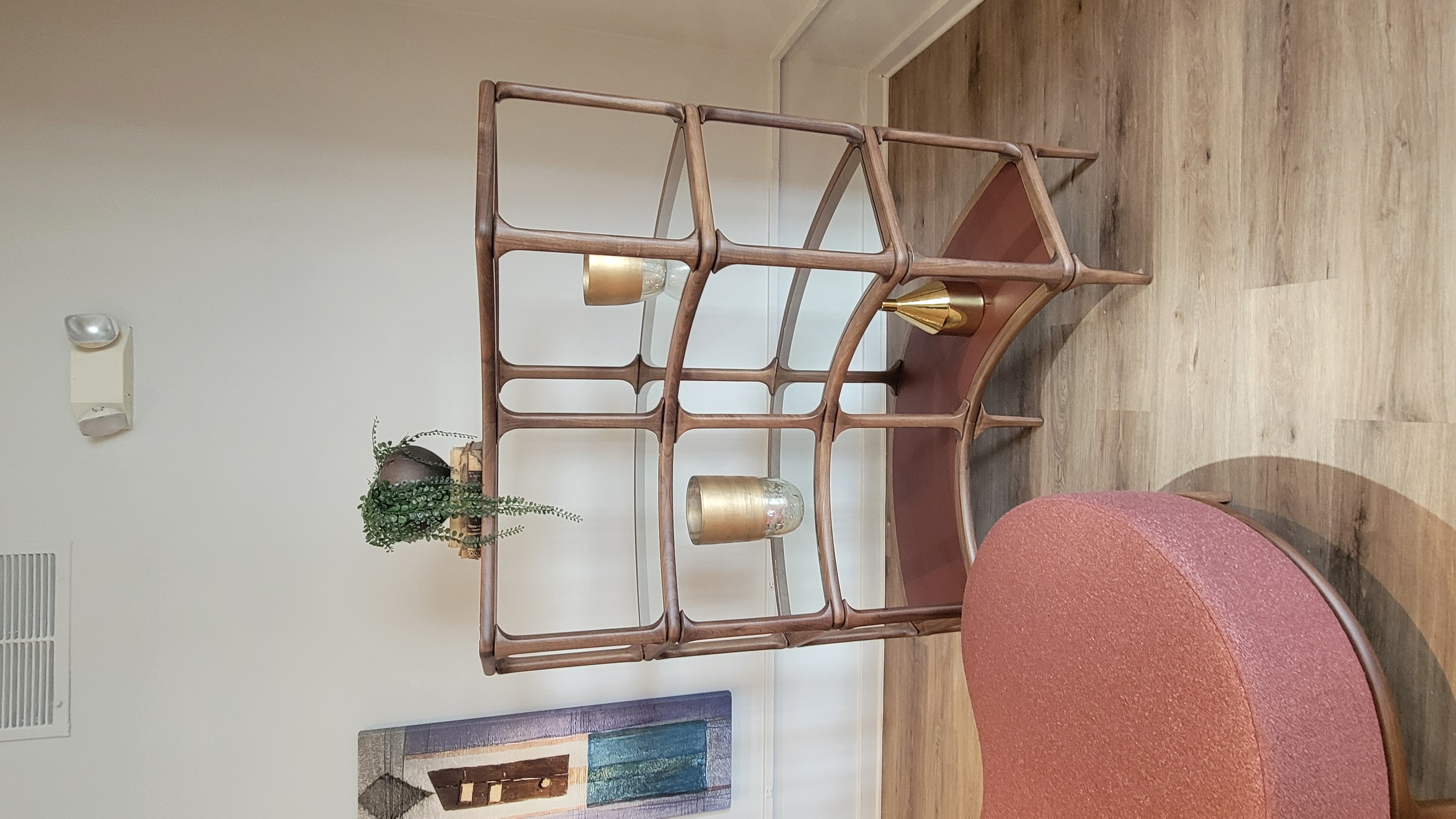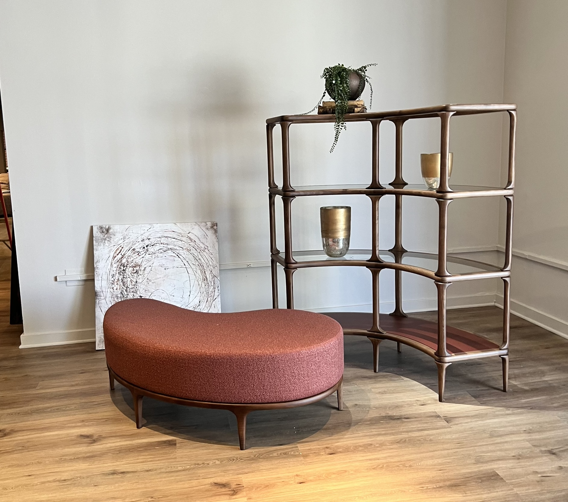 Finish: Solid Walnut w/ Lacquer Shelf # 8015 & Curved Glass ;