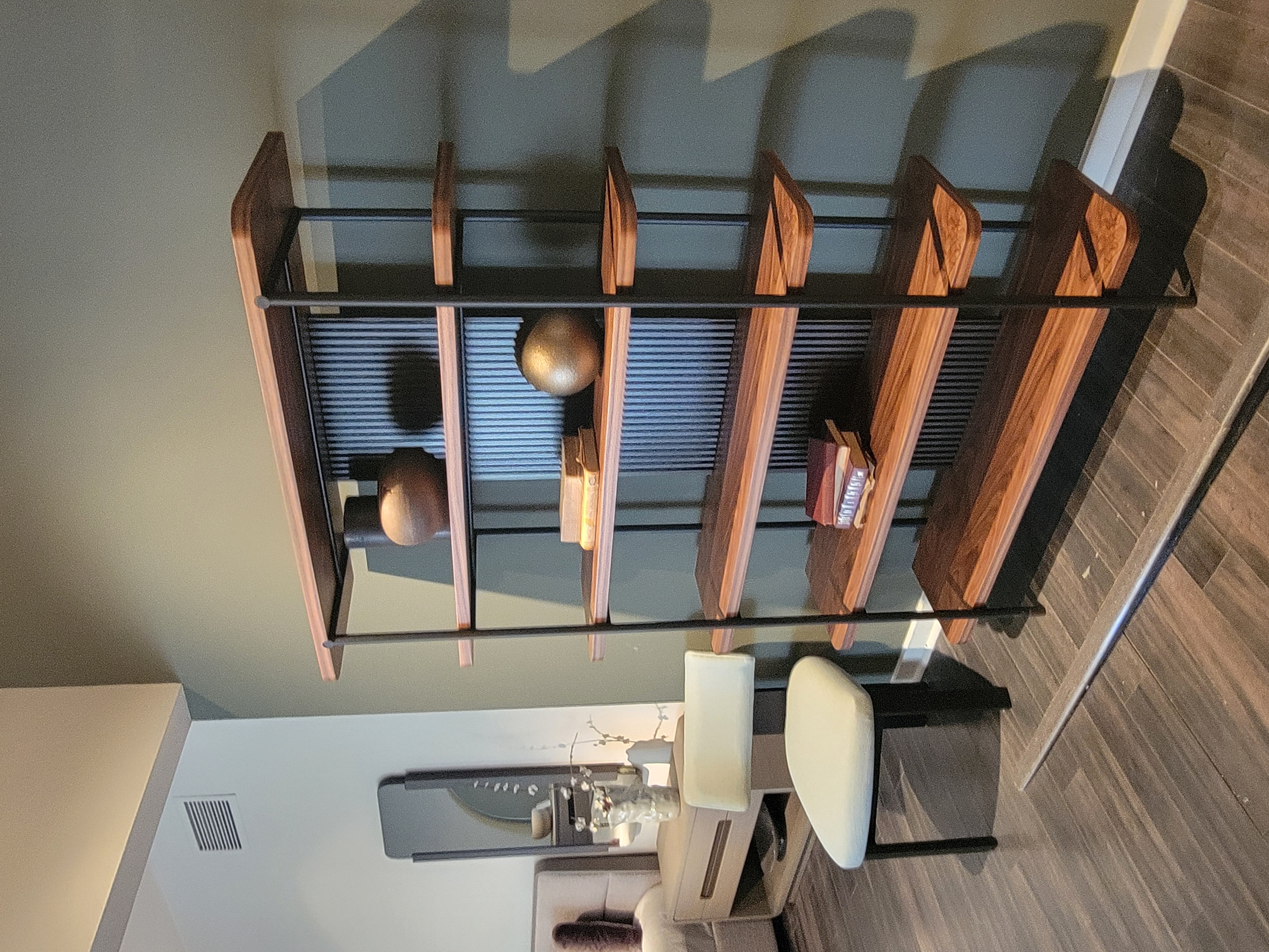 Finish: Bronze Metallic Lacquer Back Panel, Walnut Shelves, Black Metal Legs w/ Bronze Sabot;