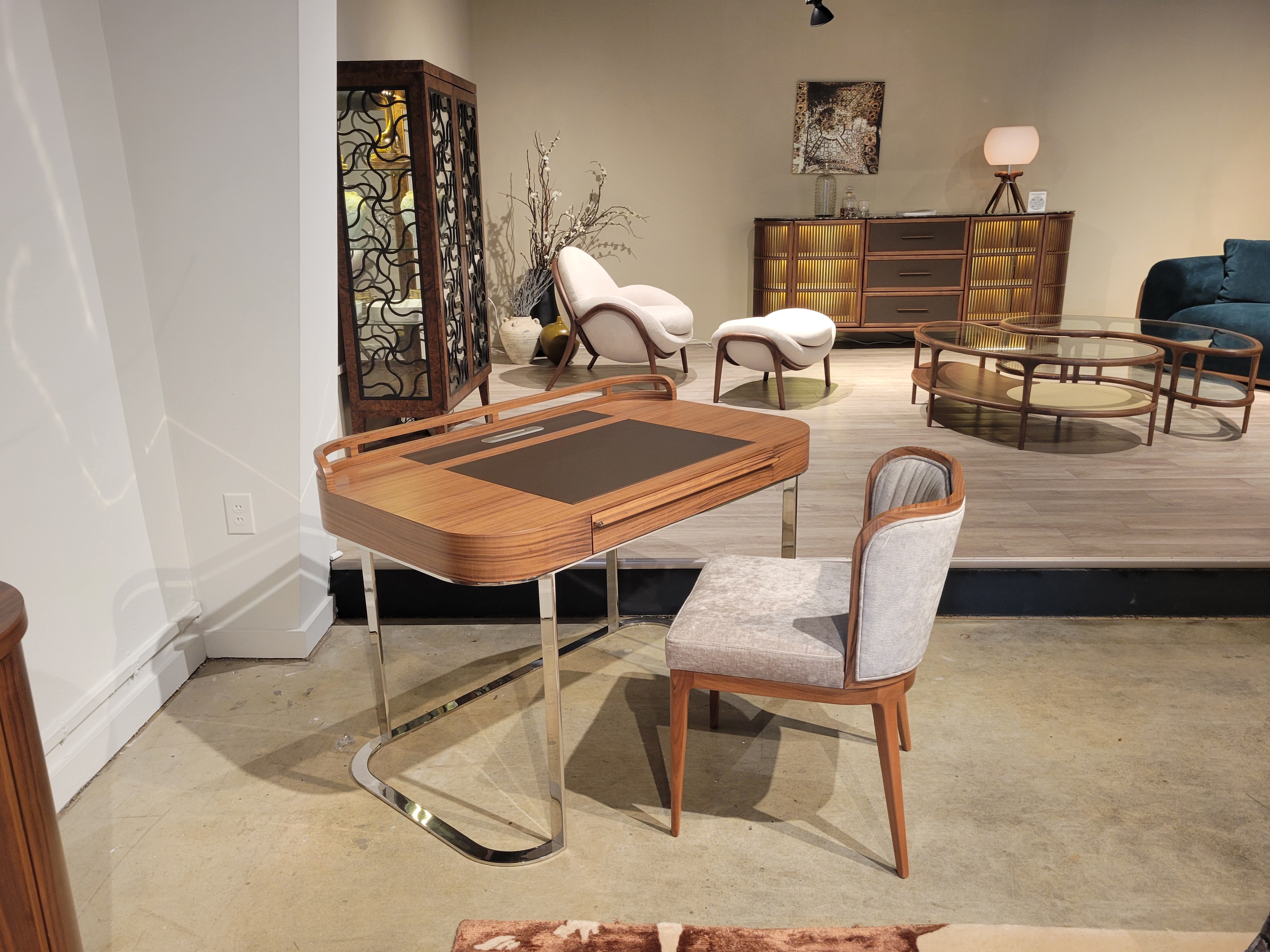 Finish: American Walnut, Leather Pad in Dark Brown & Polished Stainless Steel Legs ;