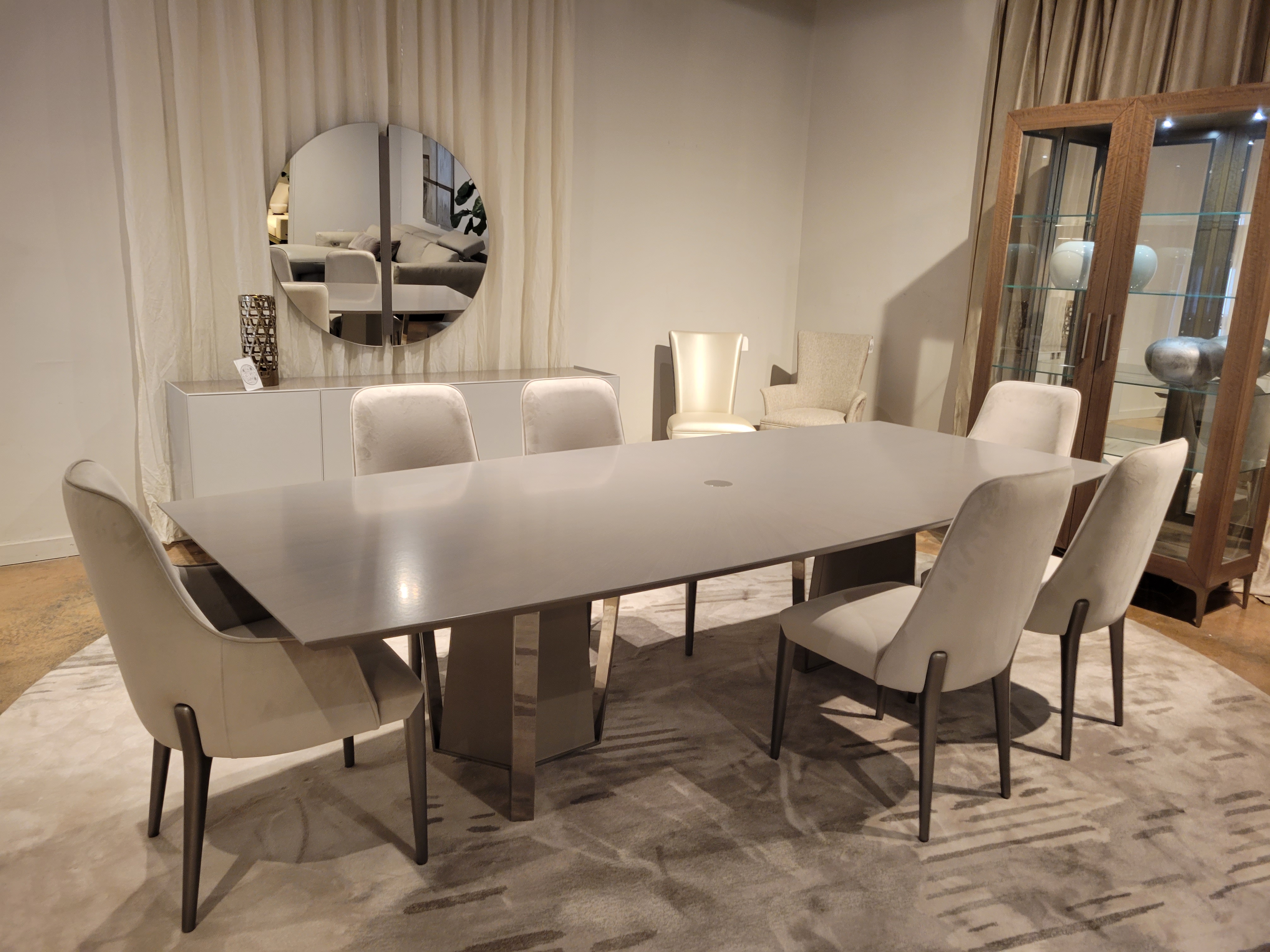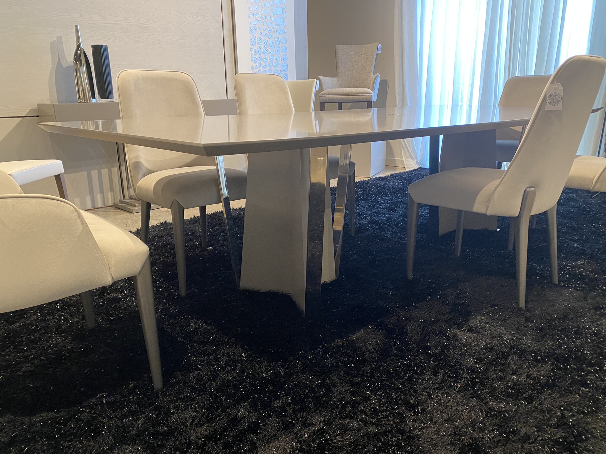 Finish: Top in Eucalyptus Plain Stain - Argento w/ Base in Cappuccino lacquer and Polished Stainless Steel Accents;